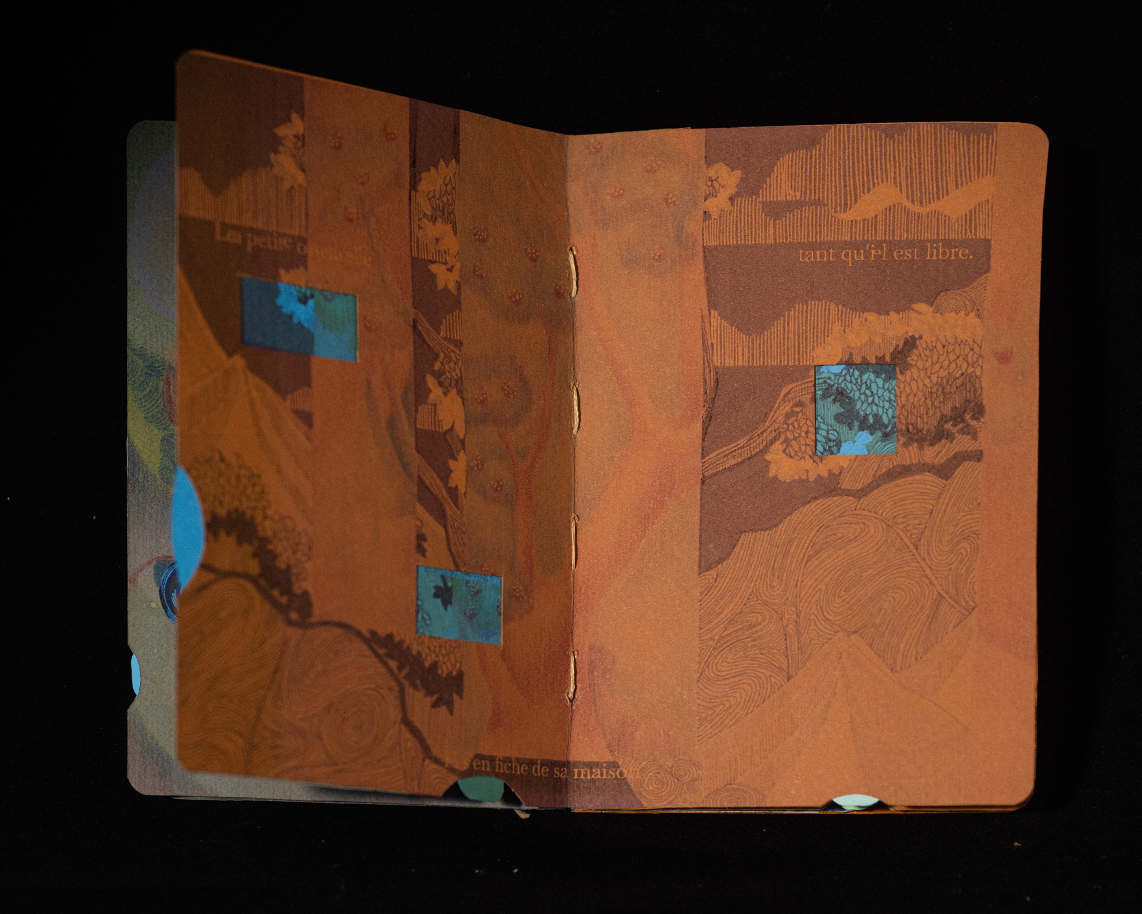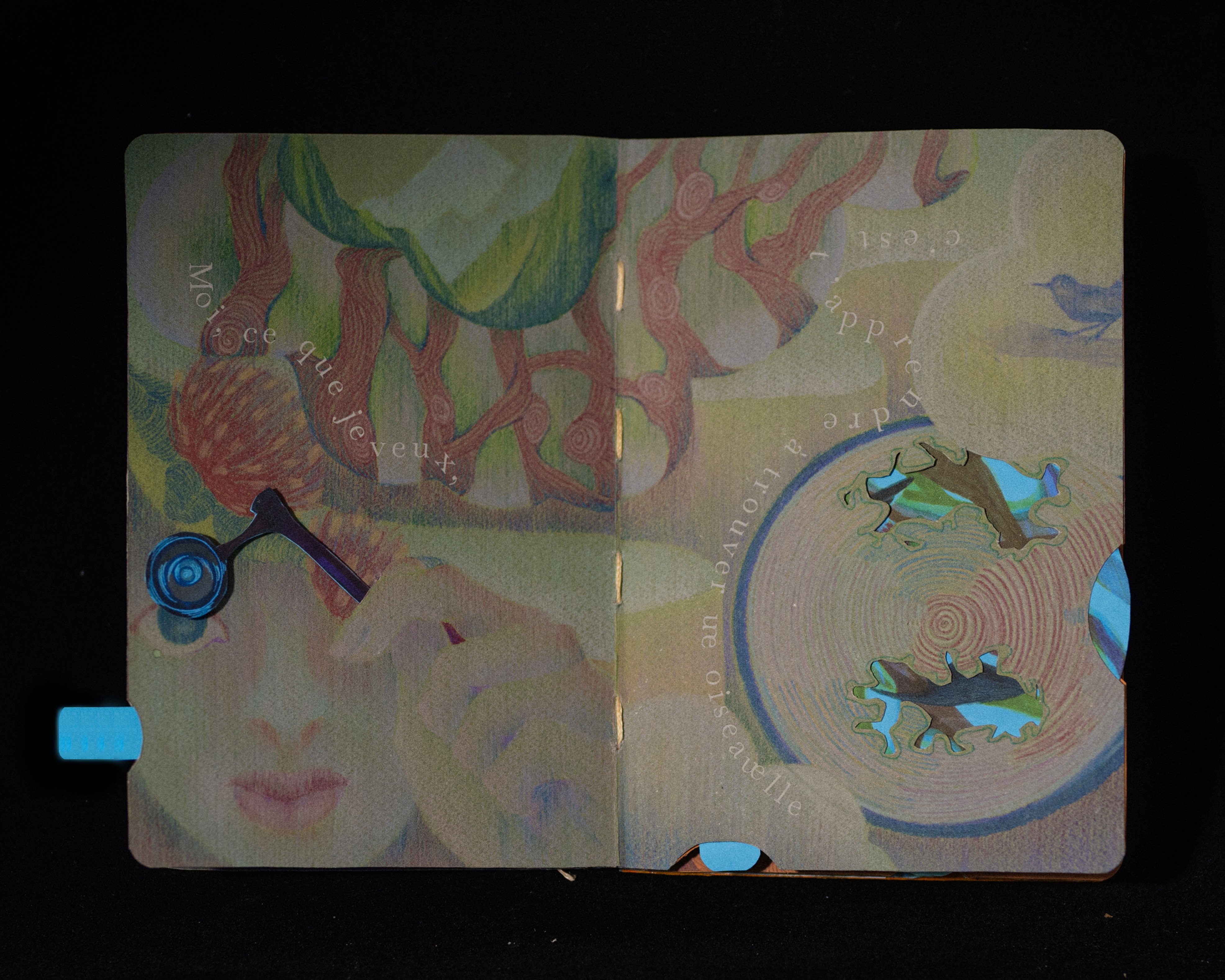J’ai utilisé un livre pop-up pour exprimer cette œuvre, afin de montrer la recherche des animaux dans l’espace et leurs relations, ainsi que le lien entre le langage humain·e et la présence animale.