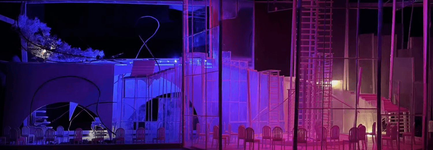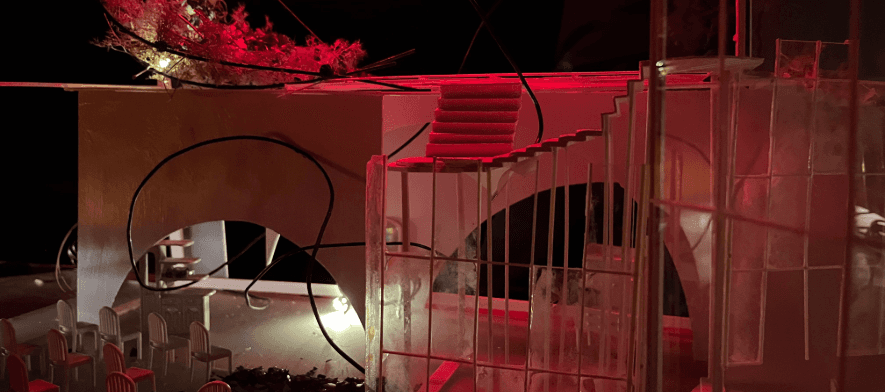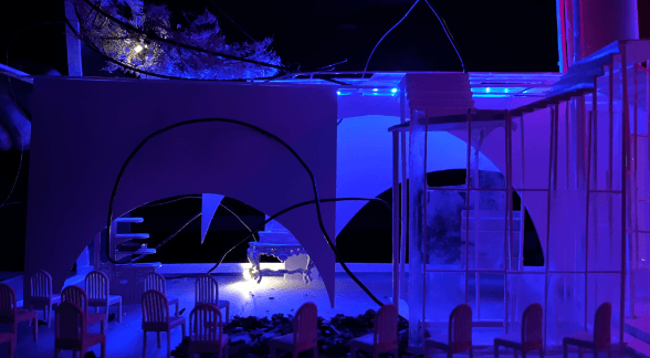 Ce projet propose une adaptation scénique immersive du roman, visant à transposer spatialement sa dimension mystérieuse, réflexive et stratifiée. En m’inspirant de la structure d’une serre, j’ai conçu un espace immersif permettant d’accueillir les différentes scènes comme autant de fragments narratifs. L’utilisation d’un espace blanc, associé à la présence de la lumière naturelle, permet de faire coexister lumière artificielle et lumière du jour.